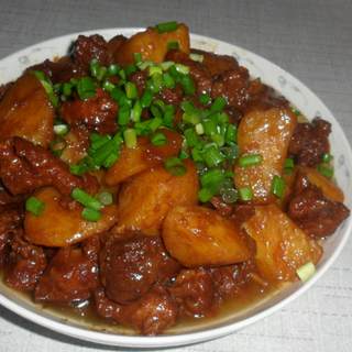 原料:牛腩肉、土豆、大酱、干辣椒、花椒、大料、葱、姜、大块腐乳、冰糖、料酒、老抽。