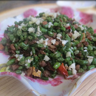 原料:豆角、肉、盐、料酒、老抽、葱姜蒜、辣椒、糖。