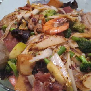 原料:培根、五花肉、包心鱼丸、鱼豆腐、明虾。