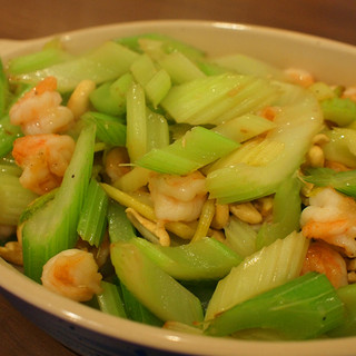 原料:芹菜、虾仁、腰果、生抽、盐、黑胡椒、白酒。