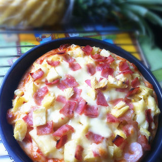 原料:菠萝、培根、高粉、虾仁、熟玉米粒、水、黄油、酵母、奶酪、番茄酱。