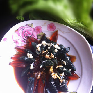 原料:松花蛋、大蒜、芝麻油、盐、白糖、米醋、生抽。