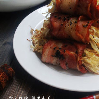 原料:培根、金针菇、香草碎、黑胡椒、孜然、油。