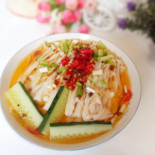 原料:金针菇、黄瓜条、酱油、醋、辣椒油、葱段。