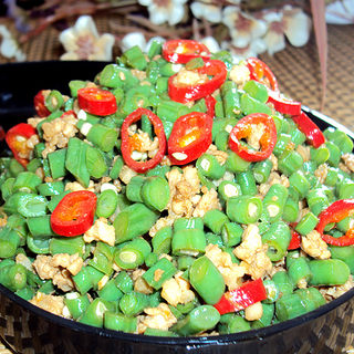 原料:豆角、肉末、辣椒、姜末、食盐、鸡精、白糖、生抽、老抽、料酒、植物油。