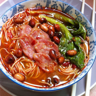原料:虾子面、腊肠、生菜、花生米、酱油、豆瓣酱、醋、糖、辣椒。