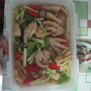 原料:鸡爪、姜、芹菜、红椒、青椒、白醋、白糖、盐、酒、水。