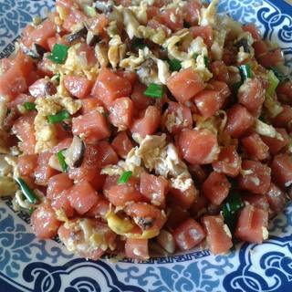 原料:香肠、鸡蛋、香葱、鲜香菇、油、酱油。