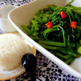 原料:空心菜、泰椒、蒜、葱、蔬菜粉。