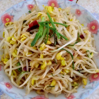 原料:黄豆芽、干辣椒、蒜瓣、葱、食用油、盐、生抽、醋、鸡精、糖。