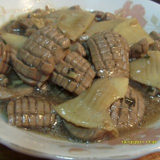原料:猪腰、冬笋、葱、水淀粉、姜、盐、糖、料酒、胡椒粉。