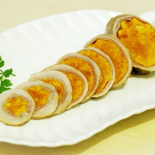 原料:猪肚尖、咸蛋黄、卤水汁、水、牙签。