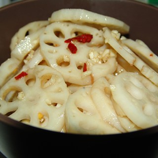 原料:莲藕、蒜末、干辣椒、醋、盐、糖、花椒、香油、食用油、鸡精。