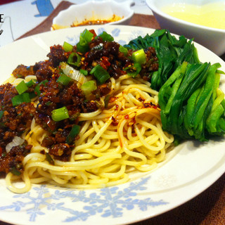 原料:面条、青椒、胡萝卜、蒜、豆豉、川味腊肠、花生碎、干辣椒。