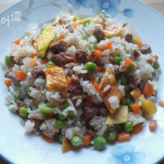 原料:米饭、牛肉、豌豆、洋葱、胡萝卜、青椒、鸡蛋、盐、鸡精、黑胡椒粉。