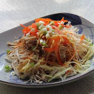 原料:鸡脯肉、红椒、姜丝、香葱、凉拌酱油、香油、红油、盐。