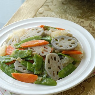 原料:雪耳、莲藕、兰豆、胡萝卜、蒜、盐、生粉、鸡粉。
