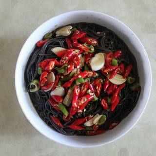原料:蕨根粉、大蒜瓣、小青辣椒、小红辣椒、生抽、醋、糖、盐、辣椒油、香油。