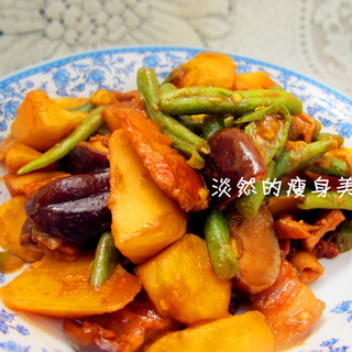 原料:香菇、豆角、土豆、猪肉、葱段、姜片、蒜瓣、青椒、大料。