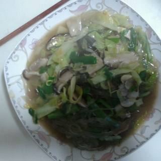 原料:韭菜、红薯粉、蘑菇、香菇、青椒、卷心菜、盐、鸡精。
