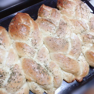 原料:高筋面粉、盐、白糖、酵母、鸡蛋、黄油、牛奶、糖粉、欧芹。