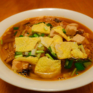 原料:瘦肉丁、豆腐丁、红萝卜、黄花、木耳、青蒜、鸡蛋饼片、葱花、姜碎、蒜碎、香菜碎、油、盐、五香粉、胡椒粉、鸡粉、生抽、醋、辣椒酱、辣椒油。