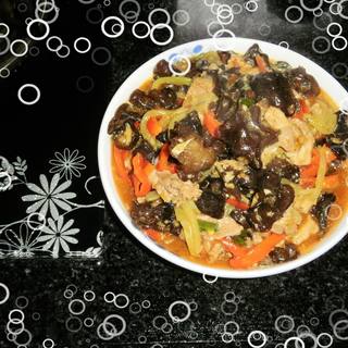 原料:猪肉、木耳、甜椒、莴笋、油、盐、味精、豆瓣、生姜、大蒜、葱、泡菜、醋、生抽。