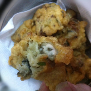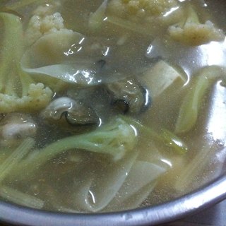 原料:海蛎、豆腐、菜花、水芹菜、番薯粉、料酒、盐、鸡精、老抽。