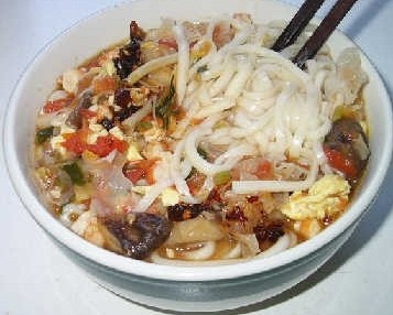 原料:五花猪肉、豆腐、土豆、西红柿、鸡蛋、面粉、香菇、木耳、黄花菜、香菜、盐、鸡精、酱油、油、五香粉、辣椒油、葱、姜、蒜。