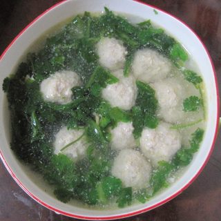 原料:猪肉馅、茼蒿、香菜、鸡蛋、淡粉、盐、香油、十三香。