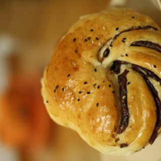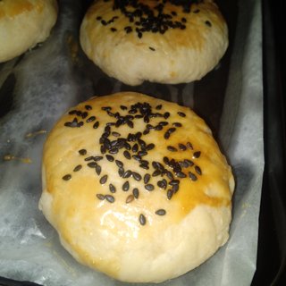 原料:高筋面粉、糖、鸡蛋、黄油、奶粉、水、豆沙、干酵母、熟芝麻。