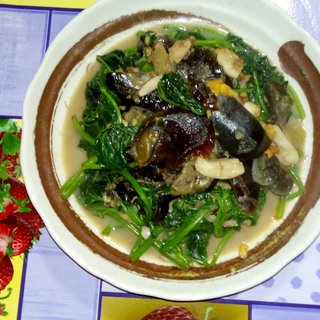 原料:番薯叶、皮蛋、咸蛋黄、蒜头、姜。