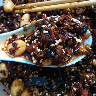 原料:猪肉末、辣椒面、去皮花生、盐、料酒、鸡精。