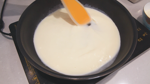 等待锅中液体沸腾,倒入剩余的菌小宝牛奶