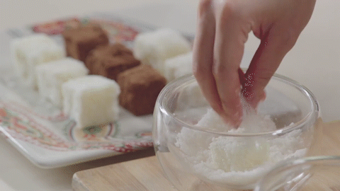 直至粘稠时取出,倒入洒好椰蓉的容器中