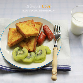 原料:吐司、鸡蛋、台式香肠、猕猴桃、温牛奶、牛奶、黄油、盐。