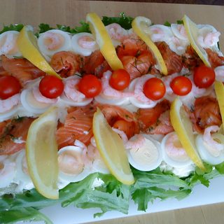 原料:土司面包、鸡蛋、三文鱼、柠檬、沙拉菜、小西红柿、茴香、cremefraiche、majonnäs、酸奶油、盐、胡椒。